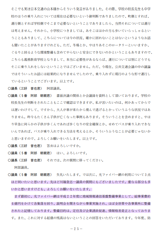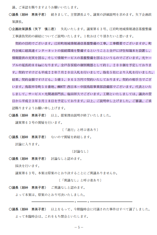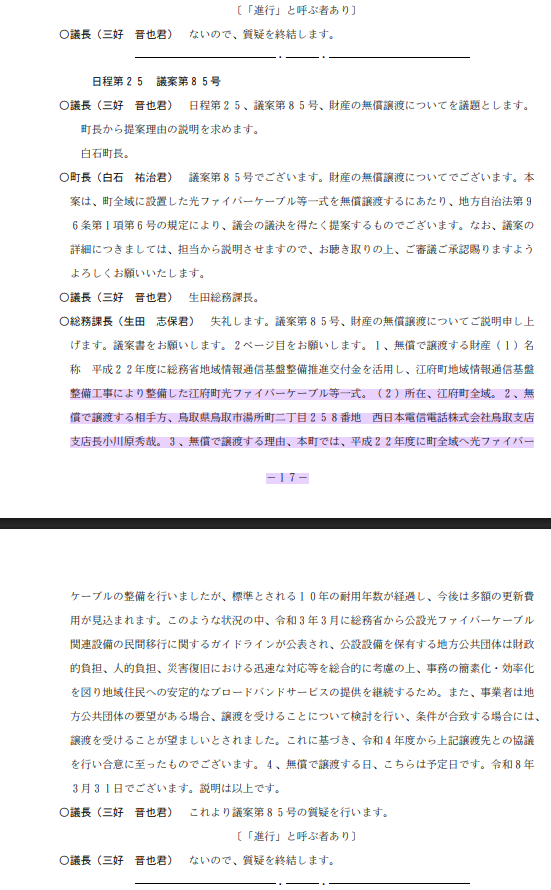 これについて、議会ではどのような議論が行われたかを知ろうと江府町ホームページに公開されている平成22年からの議事録を”インターネット””光ファイバー”で検索してみた。以下のはその要約と議事録抜粋。これによると議会で議論はされていない。