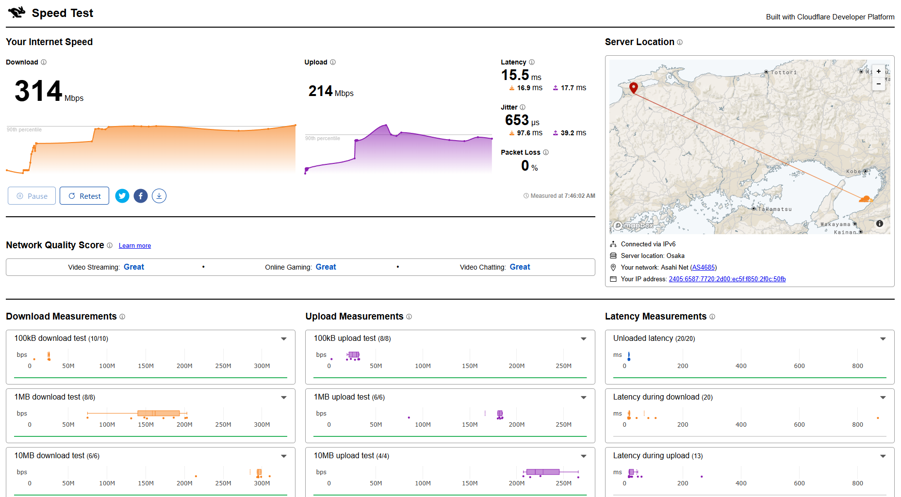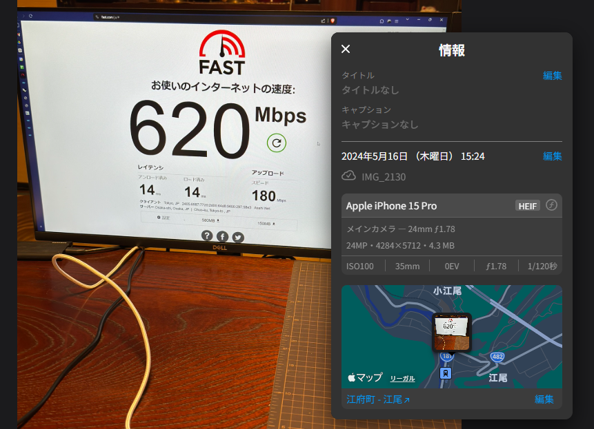 私は仕事がらビデオ会議をインターネット回線を通じて行う事が多い。江府町の回線品質は現時点でとても良好である。とくに遅延の少なさ(右の画像では14ms(千分の一秒))に満足していた。YouTube等を高画質で視聴するときは容量が大事だが、会議では会話のテンポに遅れない事が大事になるので。