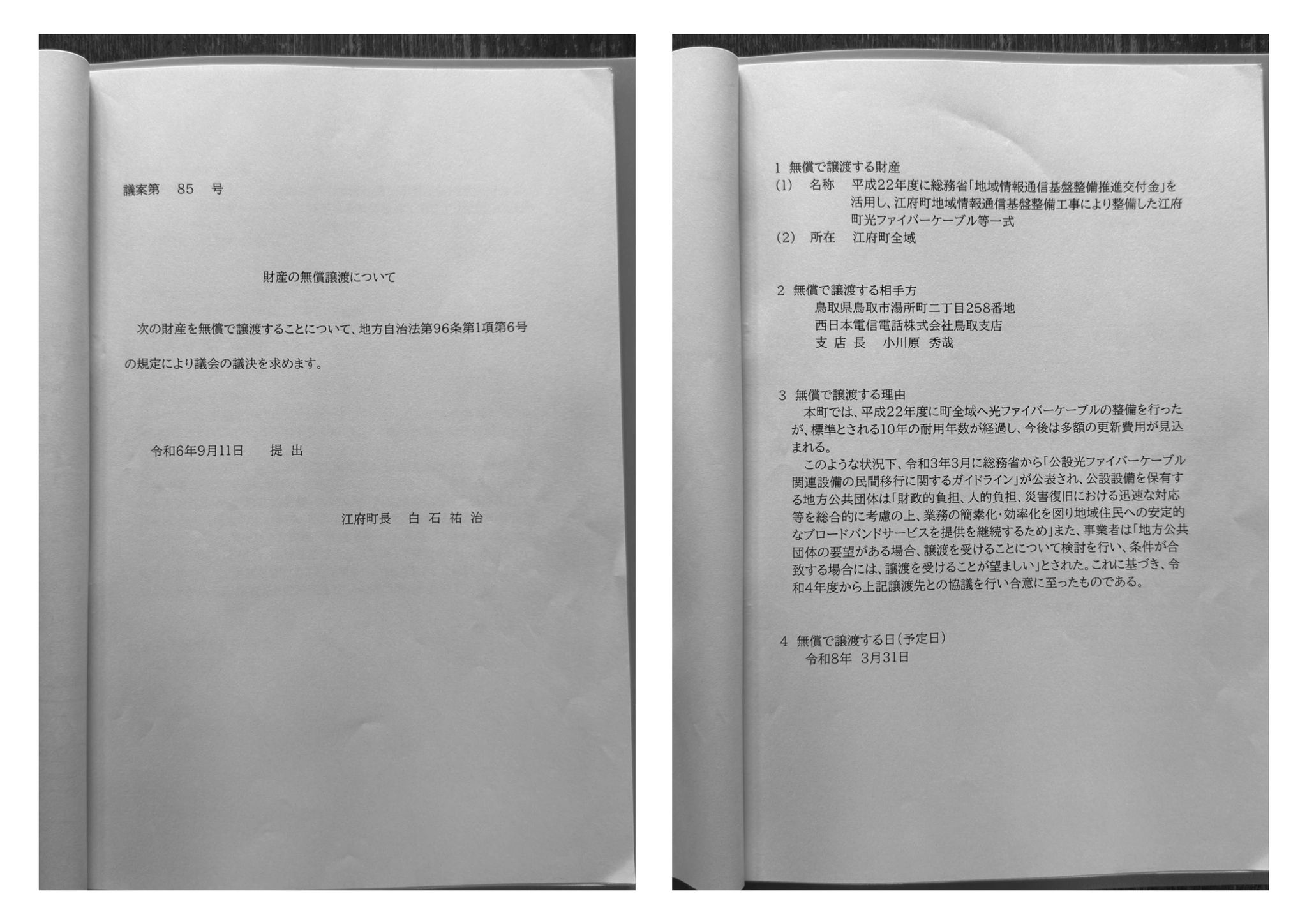 町営光ファイバー網は平成22年度に総事業費約6億円で整備されたが、標準耐用年数10年経過に伴い多額の更新費用が見込まれるため、総務省ガイドラインに基づき公設回線の民間移管を決定。設備一式をNTT西日本鳥取支店へ無償譲渡する議案が承認され、今後の維持管理・災害対応をNTT西日本に委ね、町の財政・人的負担を軽減しつつ住民への安定した通信サービス提供を継続する。