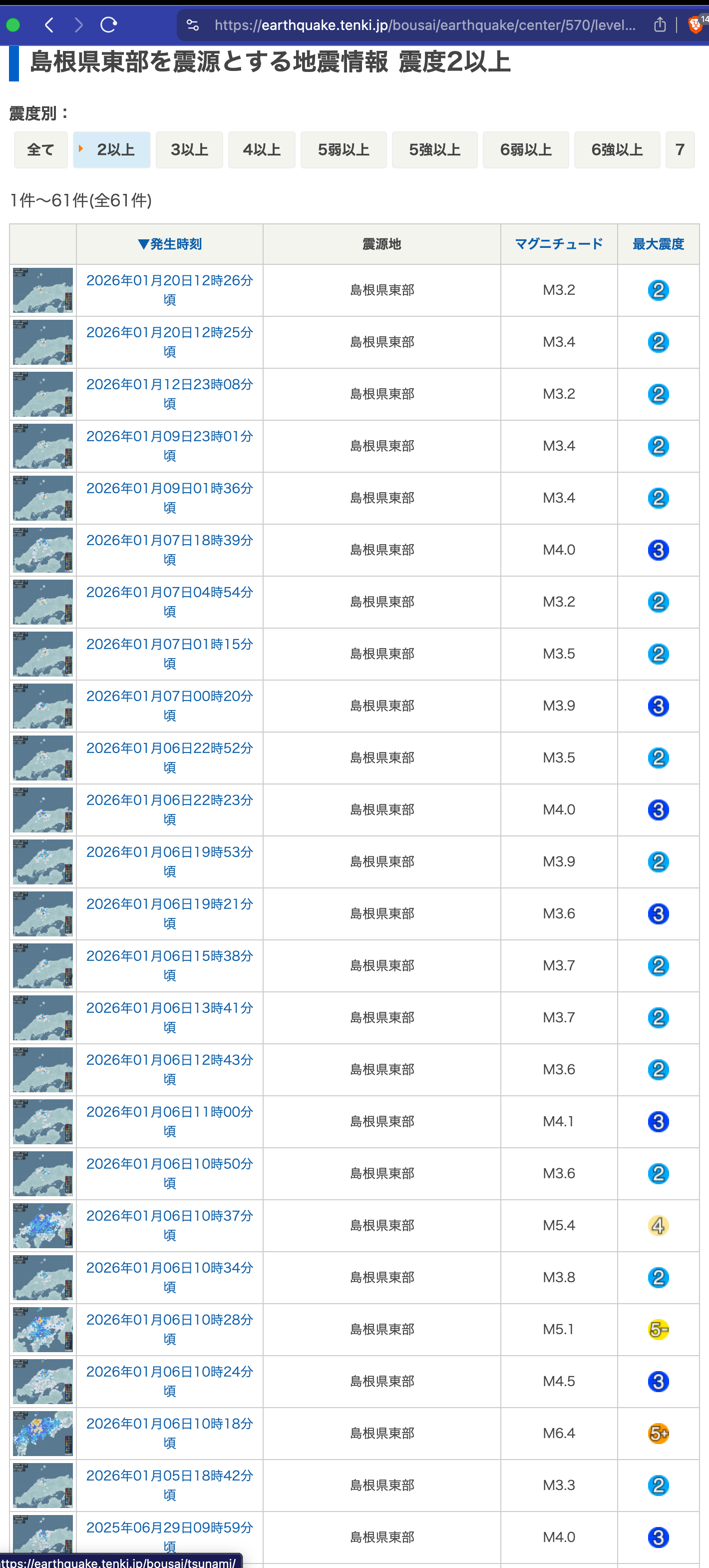 本年1/6 島根県東部を震源とする地震